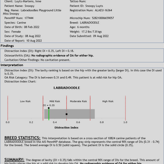 PennHip staat voor Pennsylvania Hip Improvement Program, en is een vrij nieuwe- en betrouwbare methode om risico op ontwikkeling van heupdysplasie te onderzoeken. Dit specifieke onderzoek geeft aan of een hond een kleinere kans op heupdysplasie heeft ten opzichte van het gemiddelde van zijn ras.
